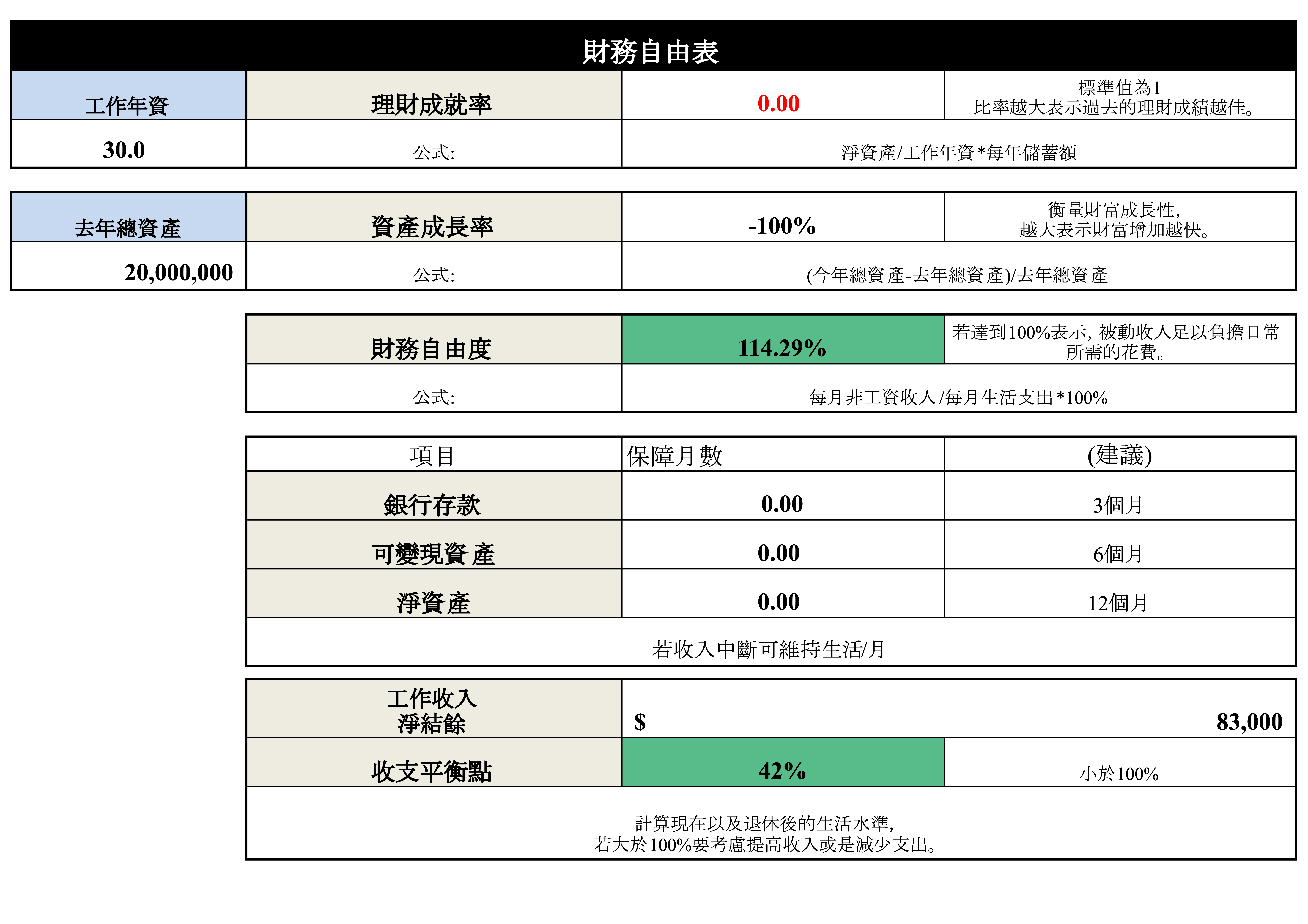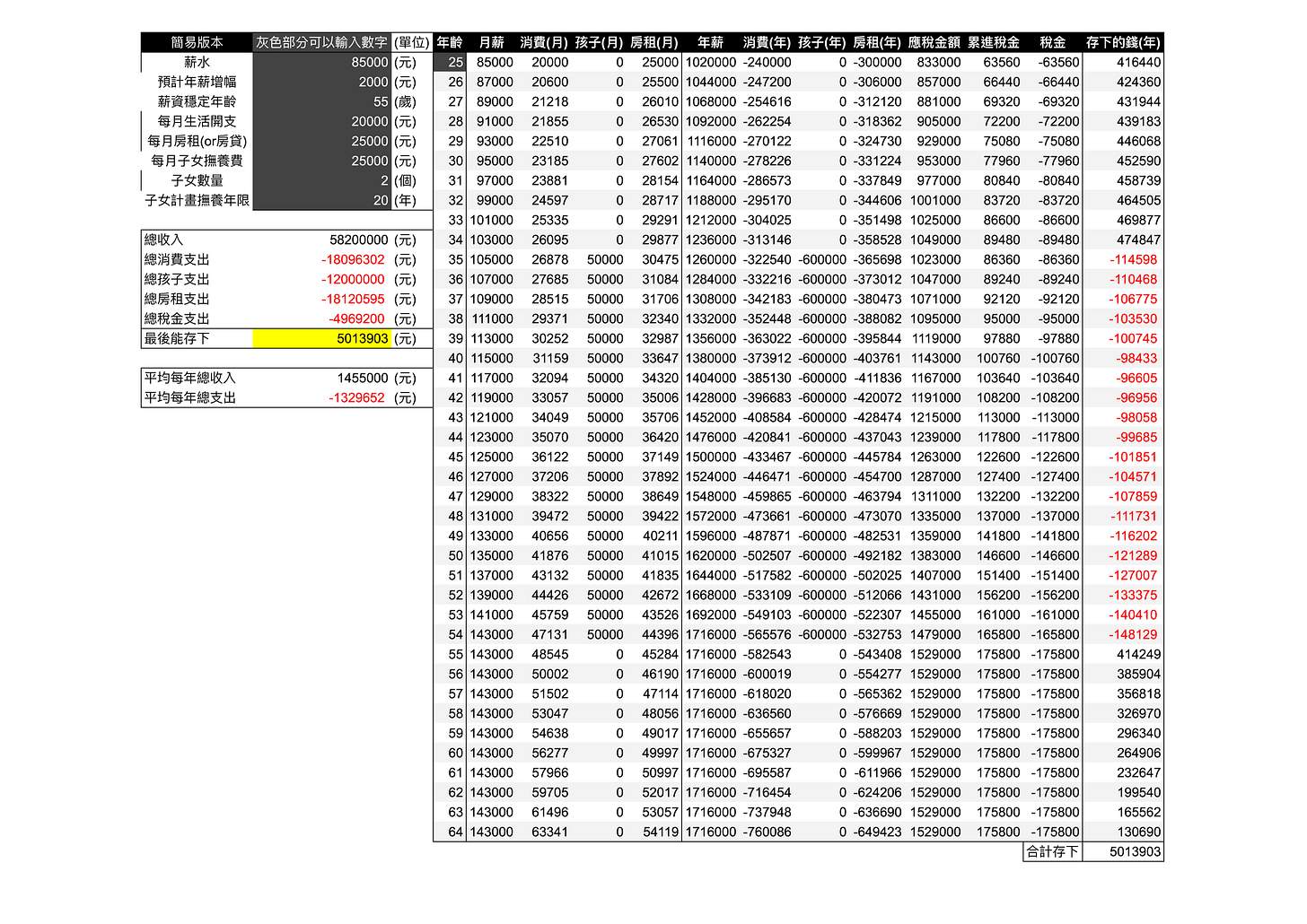 人生財務自由推演 (FIRE): 輸入你的薪資與各項參數,表格會自動推算出你到 65 歲的資產累積路徑與財務自由度。(這個表格是非常多年前朋友分享給我的簡易版。我另外有做一個進階版,未來會在付費功能。)