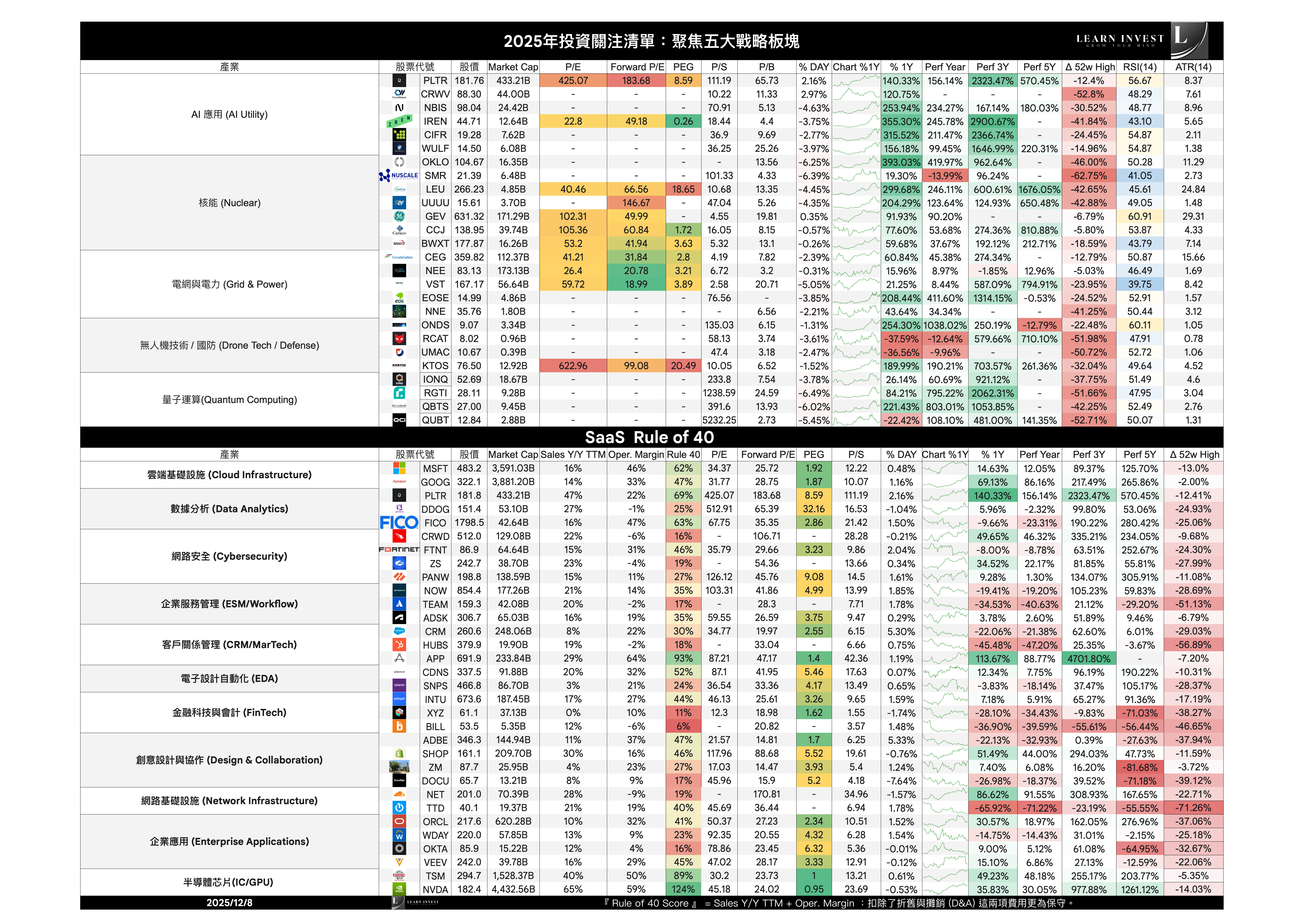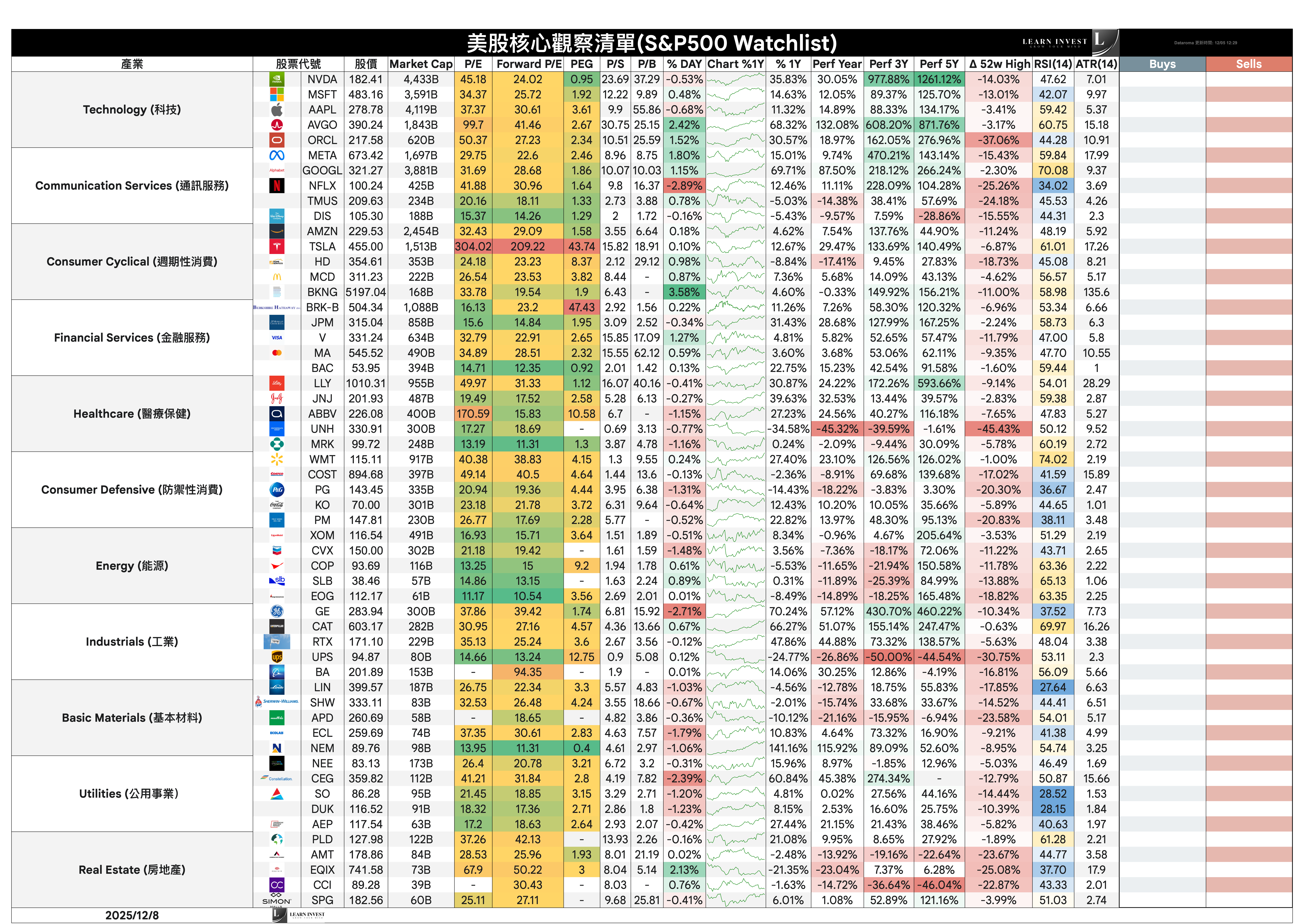 美股核心觀察清單 (S&P 500 Watchlist): 針對科技、通訊、醫療等板塊,提供 PE、PEG、RSI 等關鍵指標,一眼判斷估值高低。
