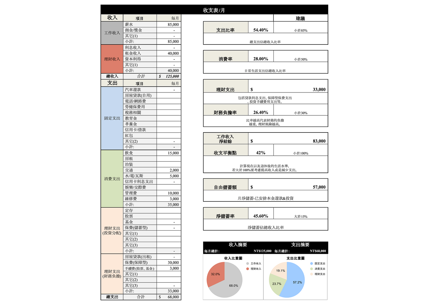 收支表 (Income Statement): 自動計算儲蓄率、消費率與自由現金流,抓出財務漏洞。