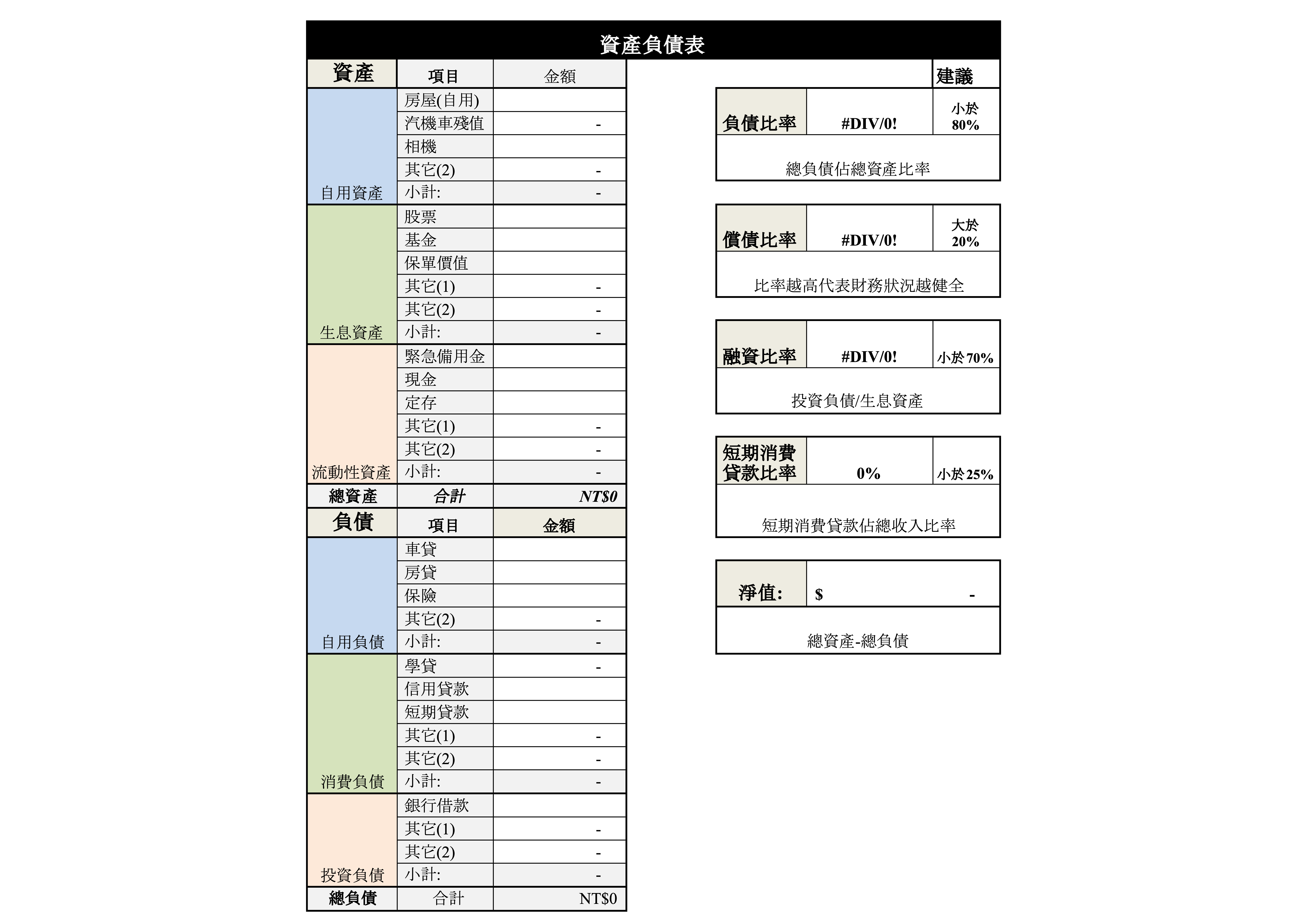 資產負債表 (Balance Sheet): 釐清你的「生息資產」與「負債」比例,計算真實淨值。