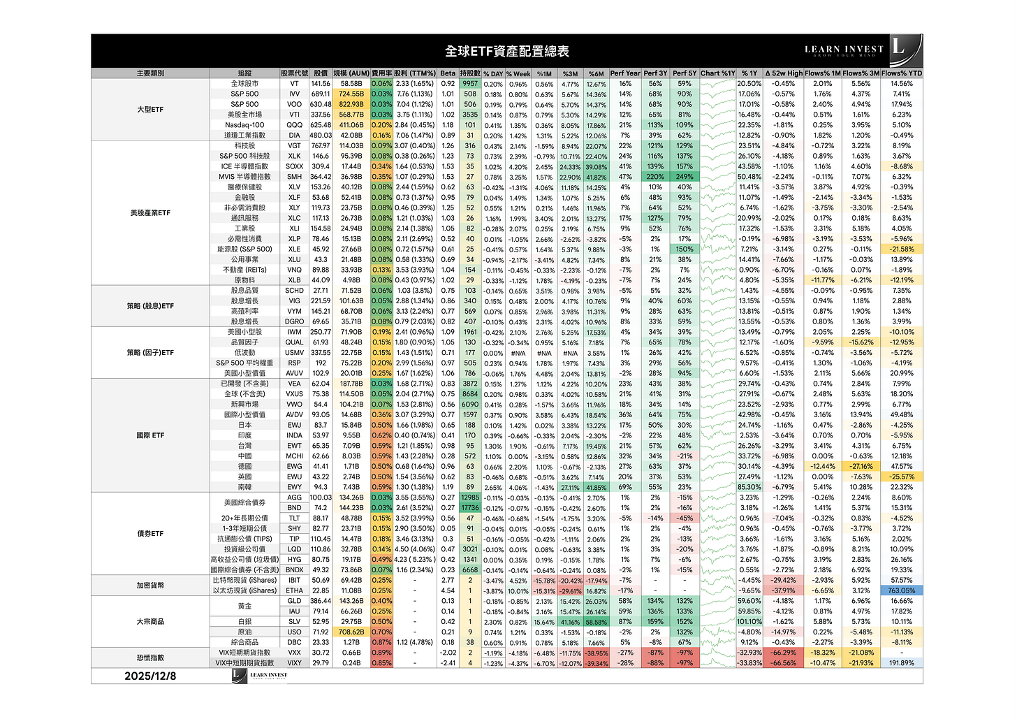 全球 ETF 資產配置: 包含大型股 (SPY, VOO)、科技 (XLK, SMH)、甚至加密貨幣與大宗商品的流向監控。