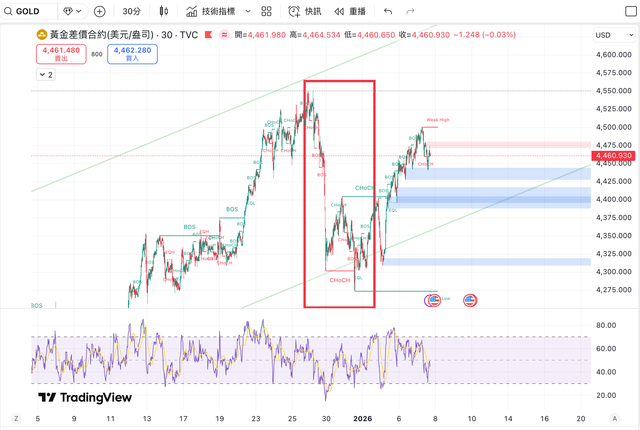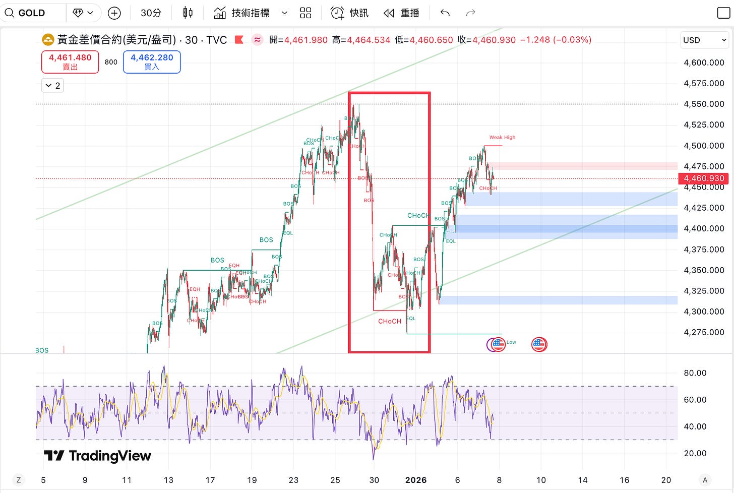 下跌真相(假摔): 年底和年初的下跌主因是黃金 2025 年漲幅高達 67%。各大商品指數(Commodity Indices)為了符合 2026 年的權重目標,必須進行機械式的「再平衡賣出(Rebalancing)」。這波回調是機構的例行公事,也是主動資金介入的時機。