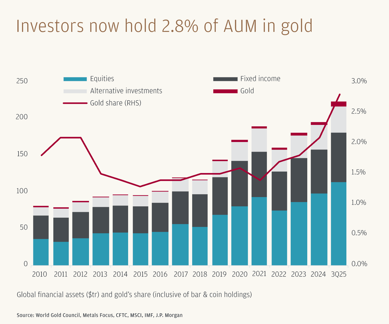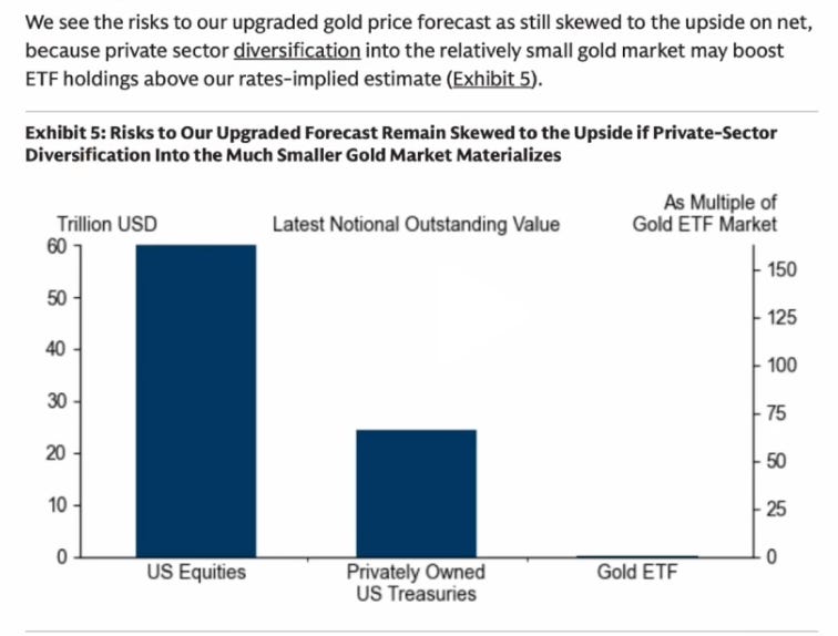這是我們看多的核心邏輯。摩根大通預測未來幾年配置比例有望升至 4%-5%。我們不需要那麼激進,只要配置比例從目前的 2.7% 溫和回升至 3.1%,金價就能突破 $5,000。