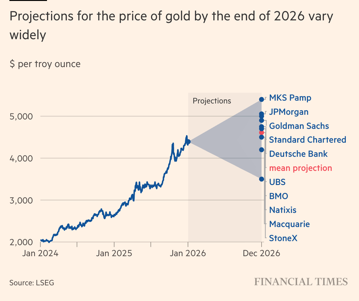 根據 最新2026年《金融時報(Financial Times)》調查的 11 位分析師平均預測,金價在經歷 2025 年的飆升後,2026 年底均價將落在 $4,610。這為多頭提供了最基礎的「貝塔(Beta)」支撐。