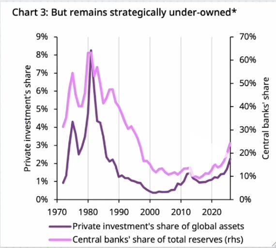 戰略端(利多): 摩根大通強調,定價權已轉移至央行手中。雖然央行購金量從 1000 噸降至 755 噸,但這僅是金價上漲後的「機械性調整」(買少一點就能達到同樣的金額佔比)。重點在於「缺口」。許多新興市場央行黃金儲備仍低於 10%,若要補足至此戰略安全線,仍有高達 3,350 億美元(約 1,200 噸)的剛性買盤在下方等著接刀。