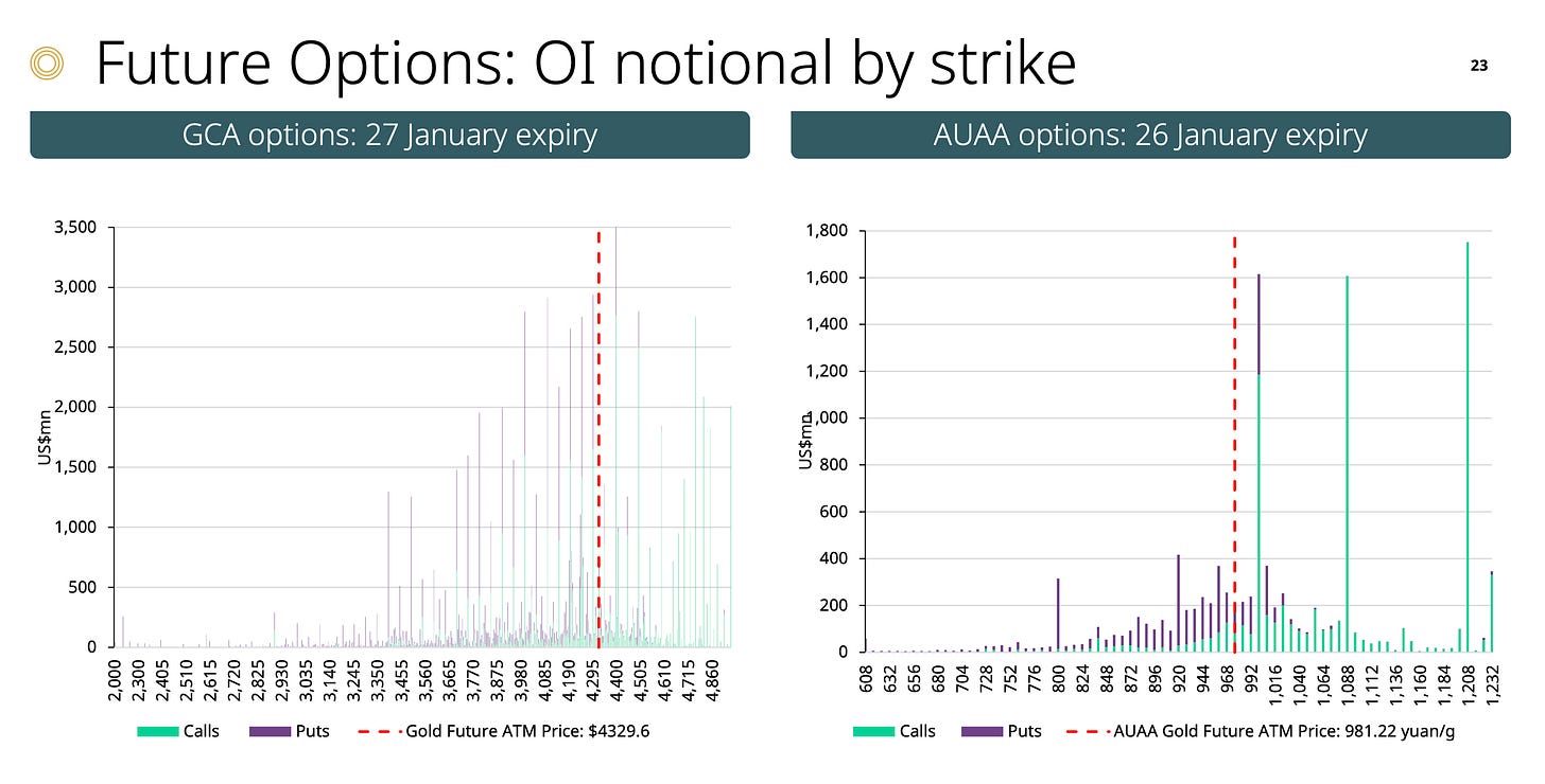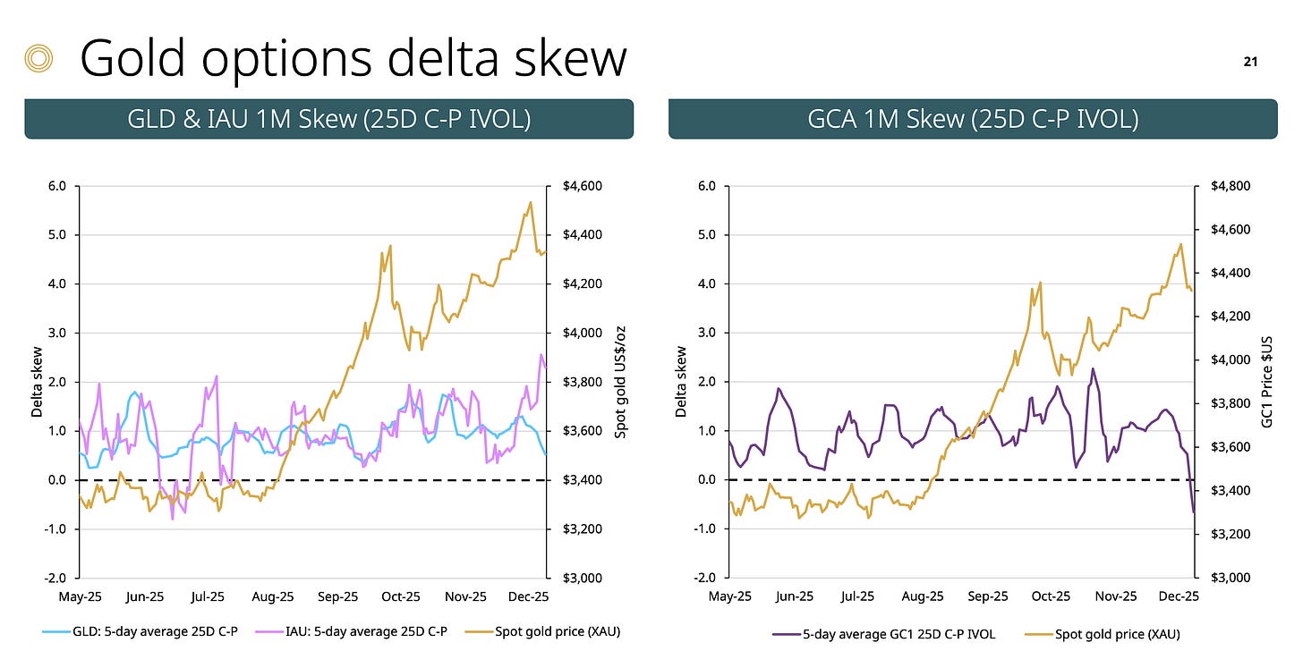結構失衡: 人民幣黃金期權呈現極端的 Call:Put 4:1 比例。這雖然看似看多,但卻是一個危險訊號(過度擁擠)。