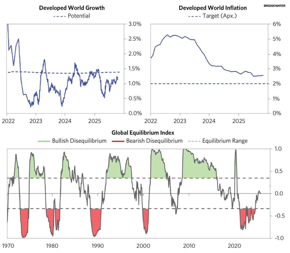 橋水的「看跌失衡」:橋水 (Bridgewater) 的模型顯示,全球已開發國家正陷入「停滯性通膨」,其「全球均衡指數」已跌入「看跌失衡」的紅色區域。