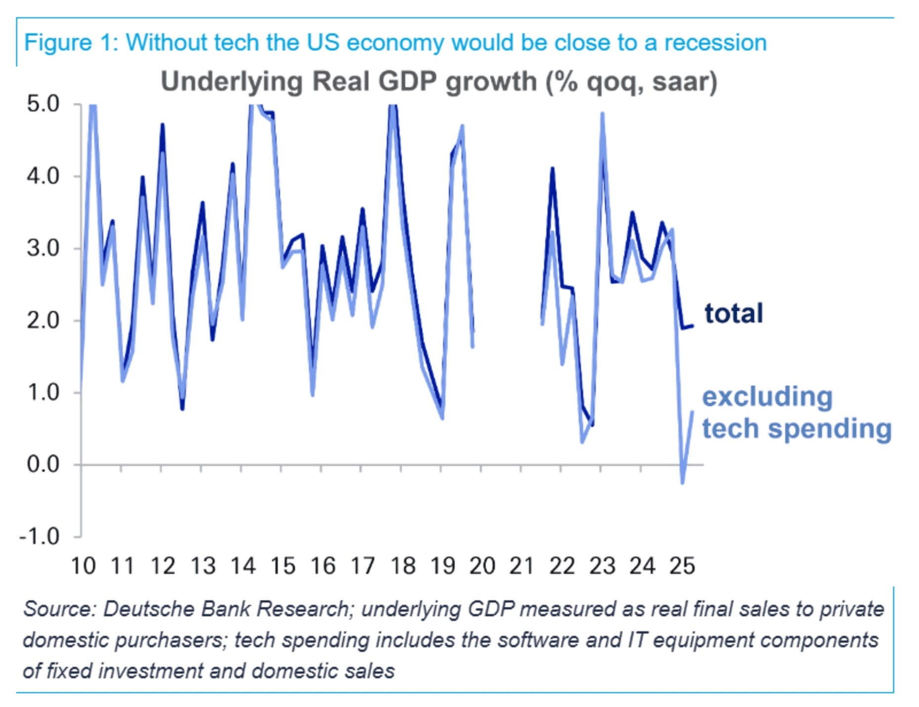 德銀的「AI 屏障」:這與美國強勁的 GDP 數據形成鮮明對比。德意志銀行的分析揭示了真相:美國的總體 GDP 完全是由強勁的「科技支出」所拉動。一旦排除這股 AI 資本支出,「實體經濟」的增長 (淺藍線) 實際上已墜落至 0% 附近,瀕臨衰退。